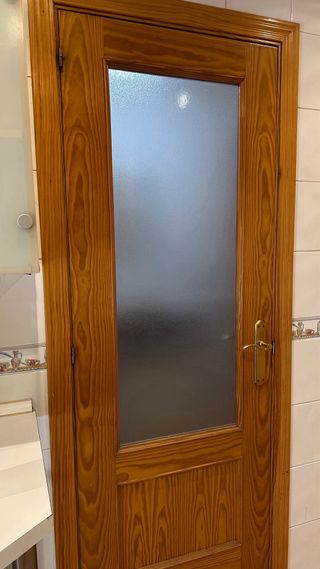 2 puertas interiores de madera color roble con 6 paneles de cristal esmerilado. Dos de 2.03x72 con cristal 2 puertas lisas de 2.03x72 y 1 de 2.03x0.62 - Incluyen manilla dorada. 25 euros unidad