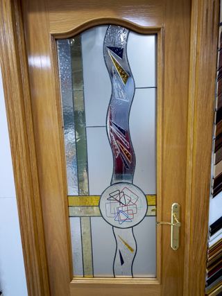 Puerta de madera de roble con un panel de cristal decorado. Ideal para interiores. Medida 72 x 201 x 3,5 cm - Material: Madera de roble. - Diseño con cristal texturizado. 20 euros cada una.