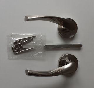 Set de dos manillas para puertas de interior, con sus rosetas y accesorios de montaje. Acabado niquel satinado. Todas en su caja original, sin usar y con toda la tornilleria correspondiente. Diametro de roseta: 5 cm. Longitud de manilla: 11 cm. Se venden independientes hasta 8 unidades (si se adquieren todas el precio final sería de 36 €).