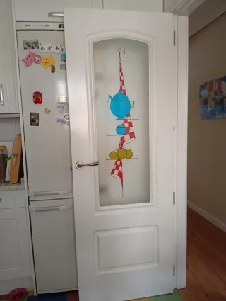 Puerta de interior para cocina con un diseño único en el cristal. - Medida: 200x72 cm - Cristal translúcido con dibujo de tetera y frutas. - Tirador metálico incluido. - Acabado blanco.