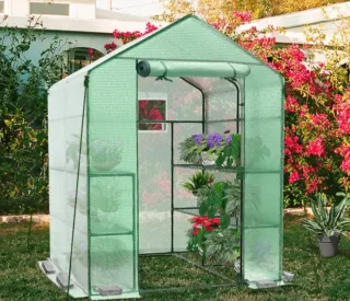 Invernadero de jardín con estructura metálica y cubierta de malla. - Color verde. - Puerta enrollable. - Estantes interiores para plantas. - Ventana pequeña. - Incluye bases para fijación.