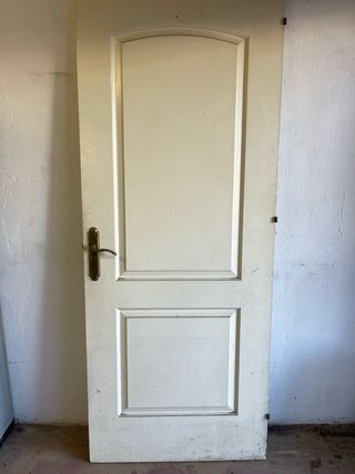 Puerta de paso de madera lacada en blanco. - Diseño clásico con molduras. - Ideal para interiores. -Ha tenido poco uso. El pomo está perfecto. Solo necesita una mano de pintura si se desea en perfecto estado