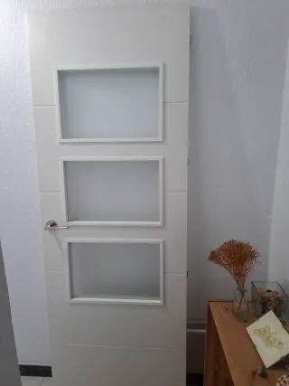 Puerta de madera blanca con un panel de vidrio satinado. Diseño moderno con líneas horizontales. Manilla de metal con inserto negro y blanco. Pueden tener alguna marca de pintura. Se venden las dos pero se pueden vender por separado. Se venden sin cerco. 50€ unidad
