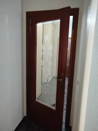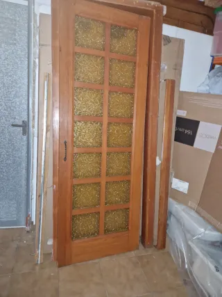 Puerta de madera con diseño clásico y elegante, ideal para interiores. Cuenta con paneles de cristal decorado que añaden un toque distintivo. - Marco de madera de tono cálido. - Paneles de cristal con motivos florales. - Tirador metálico incluido. Tengo 2 unidades