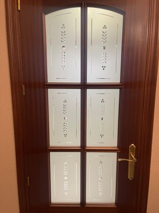 Puerta de madera maciza con diseño de cristales,dos de salón una de cocina también de cristal y dos macizas de dormitorios en total cinco. - Marco de madera. - Paneles de cristal esmerilado. - Tirador metálico dorado.