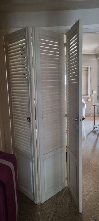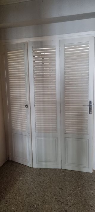 En buen estado, para lijar un poco y pintar. Se pueden enviar por Seur. Medidas 3 puertas: 1'98 alto × 1'425 ancho. Estaban en un marco de: '06 alto ×1'59 ancho. Las 3 puertas pesan 25,34 kilos.