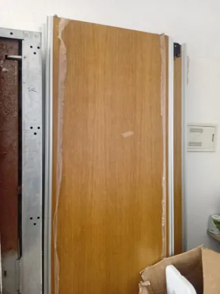 81,5 de ancho x 203 de alto Apertura izquierda Iba a ser puerta de un baño adaptado a sillas de ruedas, pero tuvimos que cambiarla por una corredera, está sin usar. Sí que estuvo colocada y por eso el marco tiene marcas de cola.