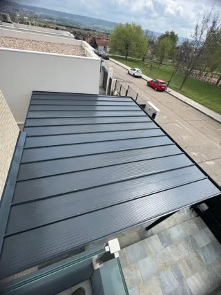 Tejado o porche de diseño moderno, ideal para exteriores. • Estructura metálica de color gris oscuro • Paneles acanalados • Consultar nuestros precios y condiciones • Entrega inmediata • Entrega en su localidad Trabajamos con cualquier tipo de puerta, en madera o cristalera, puertas correderas o abatibles y también con otras cosas de la carpintería metálica, como rejas de seguridad, barandilla, tejado/porche y otros como estanterías, escaleras y etc. Contáctanos en +34 604 21 31 70