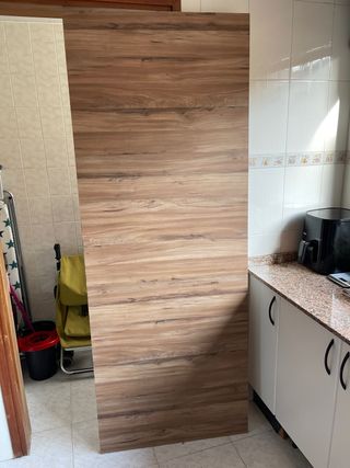 Tablón de madera con acabado imitación madera. Puede ser utilizado como superficie para una mesa, escritorio o como puerta. Compramos un trozo grande para hacer dos escritorios y este sobró, no lo hemos usado. - Diseño con vetas de madera. - Color marrón. Medidas: - 210cm de largo - 80cm de ancho No se envía, tienes que venir a recogerlo!