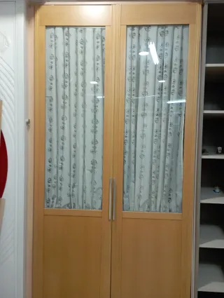 Puertas de armario abatibles en madera de Haya con cristal trasparente y visillos interiores. Bisagras de 180° Medidas 244cm X124cm Con su cerco. Paneles superiores de cristal con cortina interior. - Tiradores metálicos.