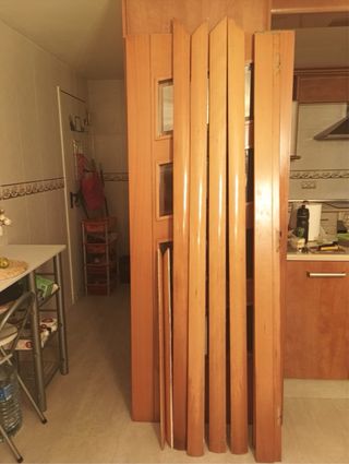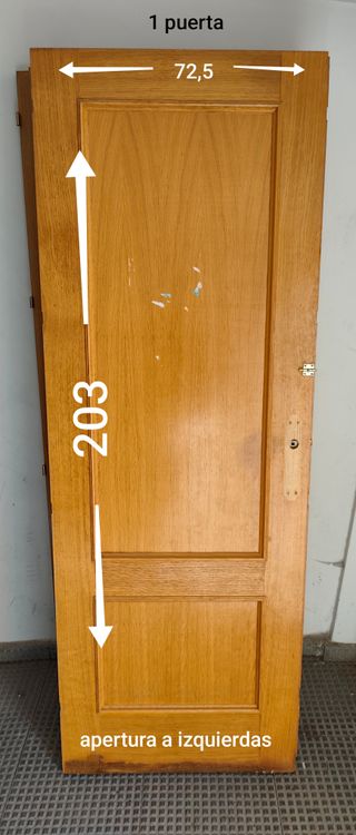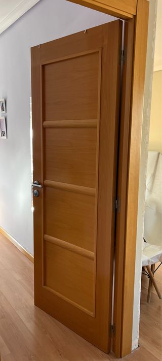 Puerta de madera con acabado natural con marcos y manetas incluidas. Todas las puertas están en perfecto estado. 8 puertas en total, se pueden vender por unidad también. Se priorizará aquellas personas que las quieran todas. Medidas: 1. Puerta comedor cristalera: 82.5 cm ancho- 202.5 cm alto- 3.5 cm grosor. Abertura izquierda. 2. Resto de puertas: 72.4 cm ancho - 203 cm largo - 3.5 grosor Abertura derecha 3 Abertura izquierda 4 - Material: Madera. - Color: Tono madera natural. - Precio por unidad. La de cristalera 35€. El resto 25€ - Entrega en febrero.