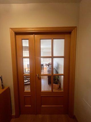 Se vende puerta doble de madera maciza en color roble con cristales translúcidos. Diseño clásico con molduras decorativas y tirador dorado. Ideal para salones, comedores o despachos, aporta luminosidad y elegancia. *Medidas:* 124 (73+48) CM Ancho * 203 CM Alto *Estado:* En muy buen estado, sin daños ni arañazos. *Incluye:* Marco y pomos. ¡Pregunta sin compromiso!
