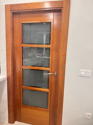 Puerta de interior de madera maciza de cristales a izquierdas con medidas 72,5cm x 203cm con premarco también, la Puerta tiene algunos arañazos en la parte de abajo por una de las caras como se puede ver en la foto por lo demás está bastante aceptable.