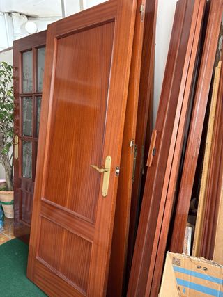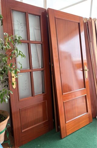Puerta maciza de interior en color sapely. Ideal para dar un toque cálido a tu hogar. Solo las puertas. - Material: Madera maciza. - Acabado: Color sapely. 55€ cristal resto 50€.