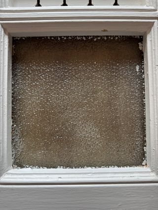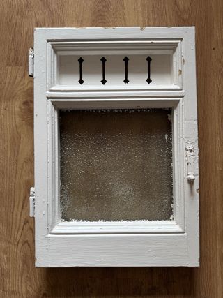 Ventana antigua con un diseño clásico y detalles decorativos. Se trata de una ventana antigua de madera con un panel de vidrio texturizado y un acabado de pintura blanca desgastada. Tiene un diseño rústico y vintage, con cuatro aberturas decorativas talladas en la parte superior del marco. El vidrio es opaco y texturizado, lo que sugiere privacidad o un uso decorativo. El estado de la pintura y la madera indica antigüedad y desgaste por el tiempo. Las bisagras son visibles en el lado derecho. El tamaño aproximado es de 55x38 cm. Ventana vintage modernista modernismo retro restauracion restaurar
