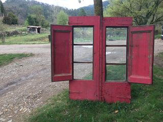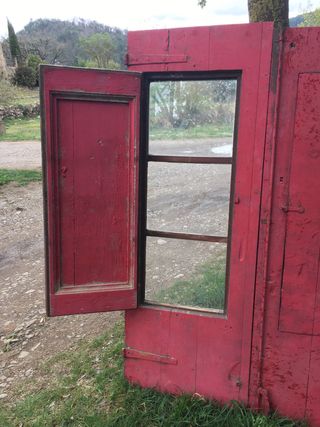 Preciosa puerta de madera antigua, ideal para restaurar o dar un toque rústico a tu hogar. - Fabricada en madera maciza de mobila vieja. - Diseño clásico con 2 partes de dos hojas cada una con ventanas y rejas totalmente funcionales. - Presenta señales de uso y paso del tiempo, lo que le da un encanto único. - Perfecta para proyectos de bricolaje o decoración. Con una mano de lasur a agua se queda nueva. -Precio negociable.