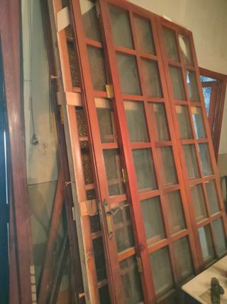 Conjunto de 2 puertas de mobila vieja en muy buen estado. Todas con tapajuntas. Se pueden vender por separado. Precio a convenir: 1- Puerta 2 hojas. 270x73cm cada hoja con marco de 159cm. Sin foto 2- Puerta de 4 hojas abatibles. 270x59cm cada hoja. Con marco.
