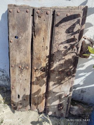 Restauramos todo tipo de puertas viejas Portones no importa su estado . -Puerta de madera maciza. -Diseño clásico con remaches de metal. -Dos hojas. -Medidas aproximadas: 200cm x 100cm (a confirmar).