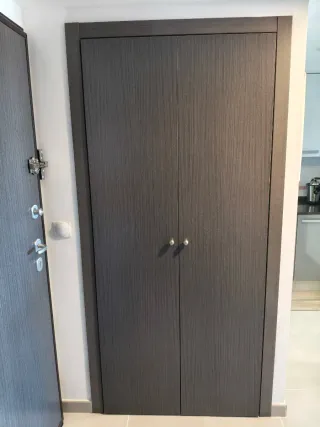 Se venden 6 puertas incluidas tapetas exteriores de 3 armarios: Armario 1: Puertas Corredera 1.40m de ancho x 2.20m de alto. Armario 2: Corredera 1.20m ancho x 2.20m alto. Armario 3: Abatible 90cm ancho x 2.00 alto. - Diseño moderno y elegante. - Acabado imitación madera. - Color wenge.