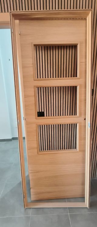 Puerta de madera para dormitorio, en perfecto estado. Incluye marco y tapajuntas. - Listones horizontales. - Color madera natural. - Ideal para renovar tu habitación.