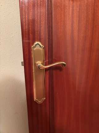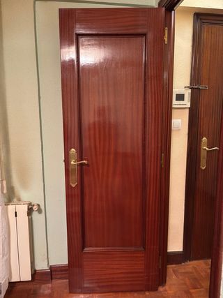 Sólo me queda 1 puerta de madera maciza, con jambas (NO TENGO MARCOS, NI PREMARCOS), revestida en sapeli (sapely), barnizada a muñeca, con herrajes y manilla dorada. En muy buen estado. *1 puerta ciega con espejo en un lado y en el otro como una puerta normal, de 72 x 199 cms de ancho (de apertura hacia la izquierda, mano derecha). Nosotros la teníamos con un caballo pegado en el espejo para abrirla desde ese lado. El resbalón se abre sólo con empujar, no hace falta manilla. Desmontada a nivel de calle.