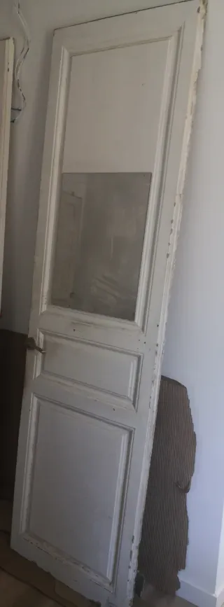 Conjunto de puertas antiguas con un diseño clásico.3 pares. para restaurar - Marcos de madera con detalles en color crema. - Paneles de cristal con un patrón decorativo. - Tiradores blancos. - Ideales para proyectos de restauración o decoración rústica.