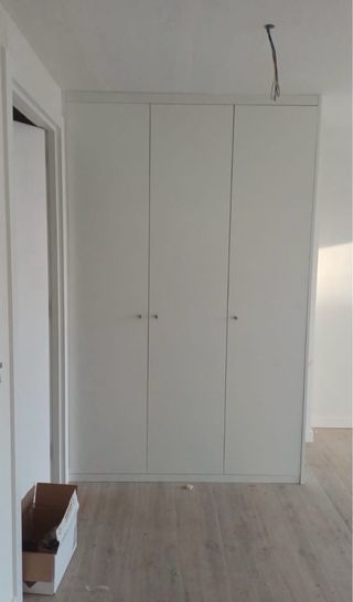 Armario de puertas correderas con un ancho de 1,50 metros. Su diseño moderno se adapta a diferentes estilos de decoración. - Puertas correderas para optimizar el espacio. - Acabado en madera clara. - El cajón negro está roto - Medidas: 2,37x1,50x66 - Zona de zapatero