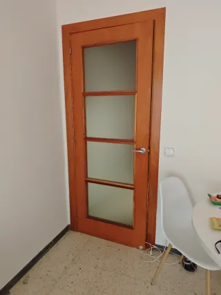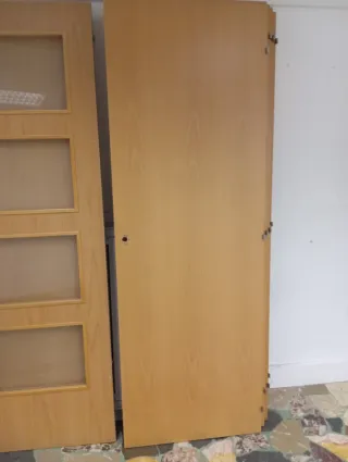 Se venden 8 puertas interiores de madera con diseño moderno. Siete son lisas y una tiene detalles de cristal, tal como se ve en las fotos. Cada una por 25 euros si se venden las 8 juntas. En caso de comprar una sola, el precio se negociará dependiendo del números de puertas que se compren. Las puertas las tengo guardadas en un trastero y tengo poca disponibilidad de tiempo. 1 puerta de 72 con cristal semitransparente 5 puertas de 72 1 puerta de 71.5 1 puerta de 61.5 210 cm de altura las 8 puertas - Acabado en madera clara. - Tapetas y manetas incluídas. - Diseño elegante y luminoso.