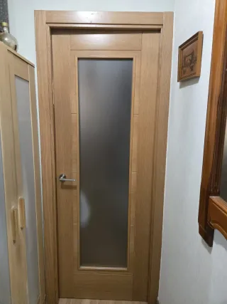 Puerta de madera con un panel de cristal esmerilado en el centro. El diseño es moderno y elegante, aportando luz a la estancia. A recoger en Madrid. Se venden porque voy a hacer reforna El precio es por unidad. - Material: Madera. - Acabado: Natural. - Cristal: Esmerilado.