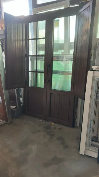 Conjunto de ventanas de madera con un diseño clásico y elegante. Perfectas para dar un toque rústico a tu hogar. Con frailero. Medidas alto 200 Ancho 120 - Marco de madera nogal. - Doble cristal para mayor aislamiento. - Diseño con paneles inferiores y superiores acristalados. - Puertas abatibles laterales.
