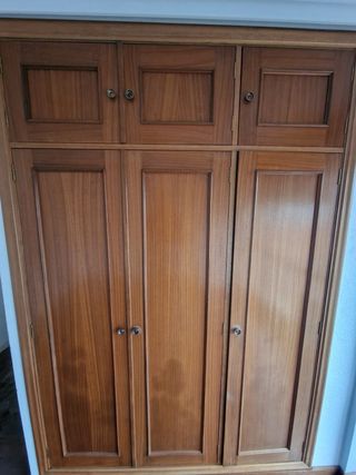 Conjunto de puertas de armario de madera con un diseño clásico. - Acabado en madera de tono cálido. - Cada puerta presenta un panel central en relieve. - Tiradores redondos metálicos. Precio, 30 euros la de 3 hojas y 20 la de 2 hojas