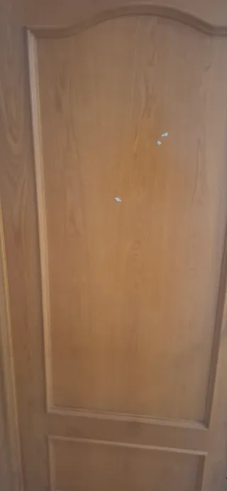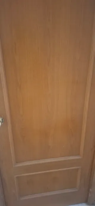 Puerta interior de madera en buen estado. Ideal para proyectos de bricolaje o para sustituir una puerta vieja. Mide 2.09 x 0.72 -Puerta maciza de madera. -Color marrón claro. -Dispone de manija.