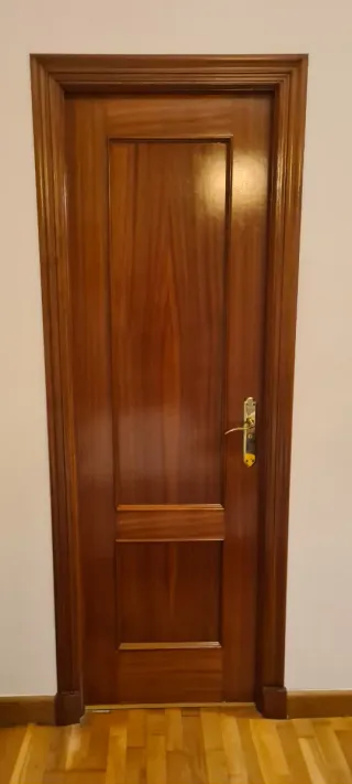 Puerta de madera para interiores con un diseño clásico y elegante. - Acabado en madera de tono cálido. - Diseño con paneles. - Incluye manilla dorada. vendo 6 de madera entera y 1 con cristal.