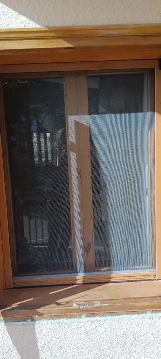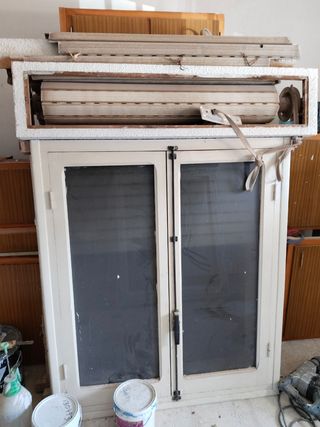 Ventana de madera con doble hoja. Ancho: 130 cm Alto: 131 cm (la ventana) más la persiana (que va empotrada en la pared) - Marco de madera. - Cierre a manivela - Doble hoja - Con persiana