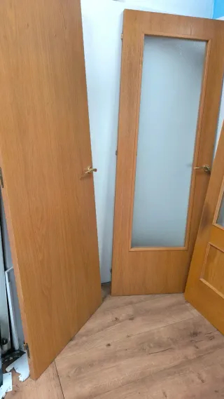Se venden puertas de madera con detalles de cristal. Perfectas para dar un toque moderno a tu hogar. 210 x 70 x 4 - Diseño con tres paneles de cristal. - Acabado en madera clara. Tienen algún pequeño arañazo que otro como se puede ver en las fotos pero por lo demás están bien. (Escucha ofertas)