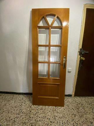 Puerta de madera con diseño clásico y detalles en cristal. - Acabado en tono madera natural. - Panel superior con divisiones de cristal. - Panel inferior liso. - Tirador metálico dorado. Puertas doble, largo: 1,26; alto:2,13 Puerta individual: largo:71,6 alto:2,01 ( las dos son iguales) Lote completo: 38€ Se recoge en Elche carrus