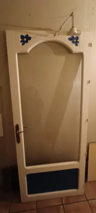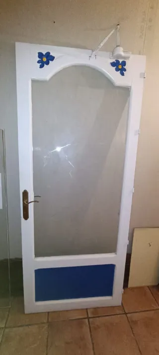 Se vende puerta exterior de madera, en color blanco. Ideal para dar un toque rústico a tu hogar. - medidas: 199'5 cm x 79'5cm - tiene 2 llaves pero la cerradura para pasar el pestillo precisa revisión. -Puerta de madera maciza. -Color blanco envejecido. -Incluye manilla. - estado de conservación según se ve en las fotos, con señales normales de uso. - apertura hacia la izquierda