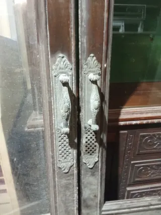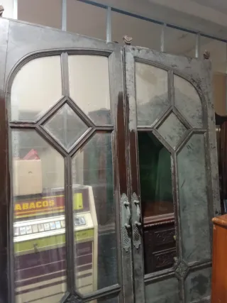 Conjunto de dos puertas antiguas de madera con detalles ornamentales. - Fabricadas en madera oscura. - Incluyen tiradores metálicos bronce con diseño labrado. - Placas decorativas con motivos florales y rejilla. Vidrios con bisel faltan 2 piezas. Antiguedad años 20 macizasiy pesadas estaban en un salón haciendo de corredera una con otra están en muy buen estado. Mejor ver VENTA DIRECTA EN PERSONA GRACIAS Precio 250€ por unidad Medidas ancho 86 cm alto 2,40