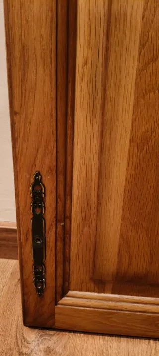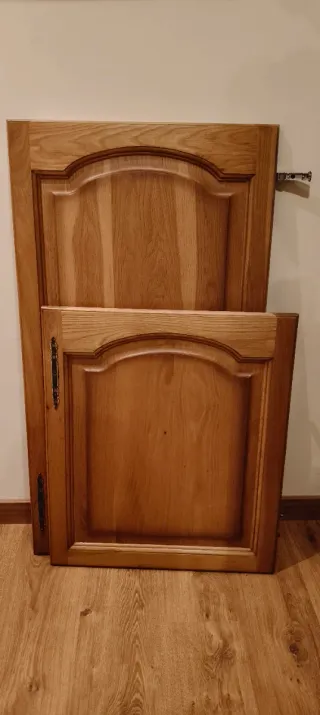 Se venden dos puertas de madera, diseñadas para cubrir puertas de frigorífico. Son de un bonito color madera natural. - Material: Madera - Diseño: Clásico con molduras