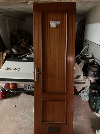 Puerta de interior de madera de sapeli. Diseño clásico con molduras. - Acabado en madera de sapeli. - Diseño con panel superior curvo y panel inferior rectangular. - Incluye manilla dorada. Varias unidades y medidas Precio unitario 35 euros Si se compran más unidades quedarian a 30 euros