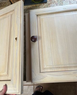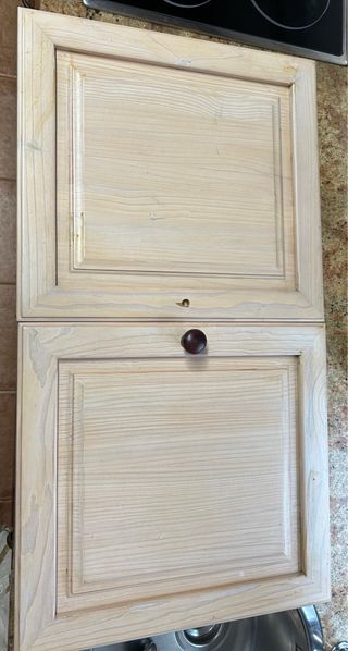 Puertas de madera para muebles de cocina. Son tres puertas en total, de color marrón claro. Se aprecian en buen estado, con un diseño clásico. - Madera maciza. - Color marrón claro. - Diseño clásico con molduras. Medidas 41 de ancho y 70 de largo la grande y las 2 chica 36 de ancho y 70 de largo