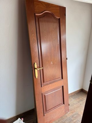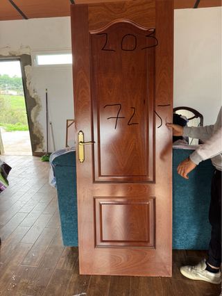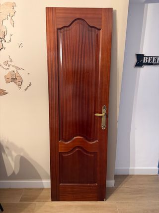 Puertas interior de madera con diseño clásico. - Acabado en tono caoba - Incluye manilla dorada QUEDA DISPONIBLE: 1x apertura izquierda de 62.3x200,5cm Solo recogida VENDIDA apertura a derecha de 72,3x200,5cm VENDIDA apertura a derecha de 72,3x200,5cm VENDIDA apertura a izquierda de 72,3x200,5cm