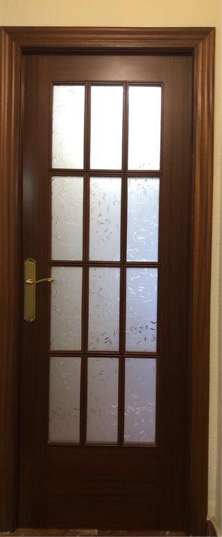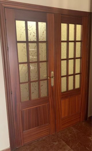 Conjunto de puertas de interior de madera maciza, 30€ cada puerta, con detalles de cristal: - 1 puerta doble de salón. - 2 puertas ciegas de baños. - 4 puertas ciegas de habitación - 1 puerta entera cristal de paso - 2 puertas cristal y madera de paso - Acabado en madera oscura. - Cristal con diseño de hojas. - Tiradores dorados.