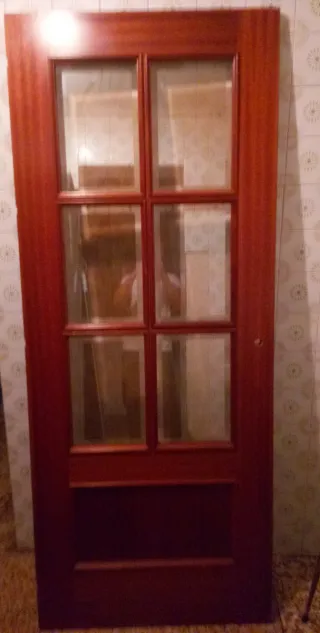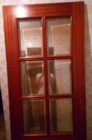 Puerta de madera con paneles de cristal. 6 papeles de cristal. Medidas, de alto 2.04 cm. De ancho, 68 cm . Fondo 3,5 cm . - Diseño clásico con múltiples divisiones de cristal. - Marco de madera oscura.