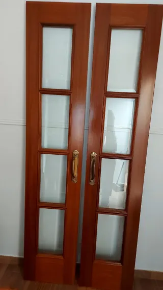 Elegante puerta doble de madera con paneles de cristal. - Acabado en madera de tono cálido. - Diseño con dos amplios cristales. - Tirador metálico dorado.