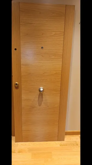 Puerta de madera blindada con un diseño clásico y funcional. Cuenta con un panel de cristal en ambos lados y todo el sistema de cerradura en perfecto estado.