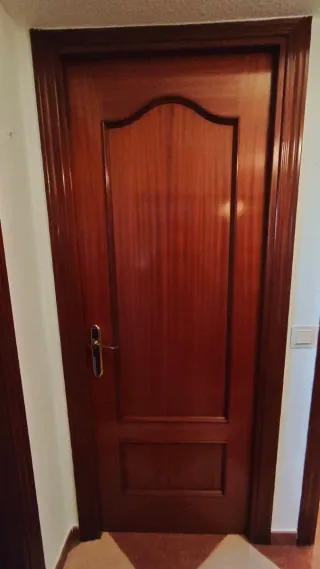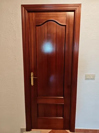Conjunto de puertas de madera de cerezo, con un diseño clásico y elegante. - Material: Madera de cerezo. - Diseño: Paneles de madera con molduras. - Herrajes: Incluye manillas. - Cristal Se venden todas juntas o por separado, preguntar medidas y precio por mensaje.