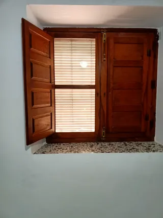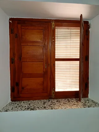 Ventana de madera con persiana enrollable. - Marco de madera. - Persiana enrollable blanca.
