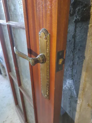 Conjunto de dos puertas de madera con detalles de cristal. - Fabricadas en madera de tono oscuro. - Cada puerta tiene varios paneles de cristal. - Un tirador dorado en una de las puertas. Las voy a retirad por eliminar sus tabiques 20€ la grande y 10€ cada una de las otras dos.