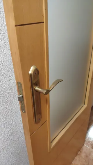Puerta de madera roble de interior con detalles de cristal. A RECOGER EN ZONA TEATINOS - Marco de madera. - Cristal esmerilado. - Tirador dorado.